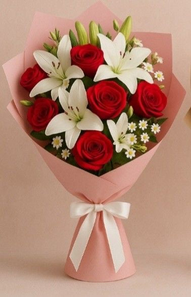A charming hand-tied bouquet featuring 6 radiant red roses, 2 graceful white lilies, and 3 cheerful daisies, artfully arranged with lush greenery for added fullness and freshness. The blooms are wrapped in fancy pink sheets and finished with a beautiful ribbon tie, creating a perfect balance of romance, purity, and joyful charm. Ideal for expressing love, admiration, or heartfelt wishes.