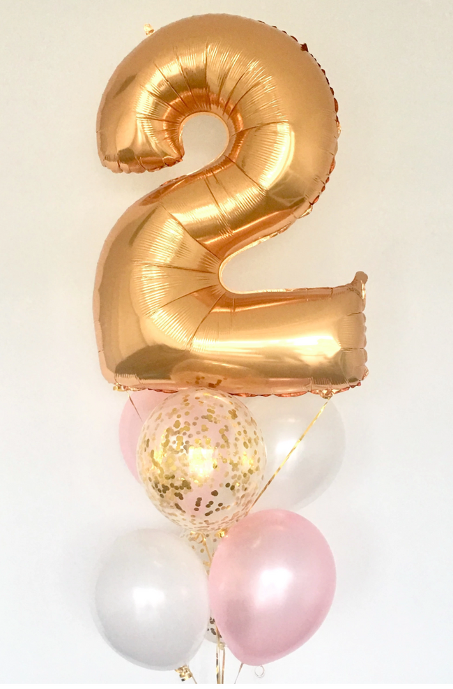Celebrate in opulent style with our Golden Jubilee balloon bouquet! Featuring two majestic 34-inch helium balloons in radiant gold, shaped as the number '2' to mark the milestone. Adding to the grandeur are two dazzling gold glitter balloons, symbolizing the brilliance of the occasion. Complementing this luxurious arrangement are two delicate pink and two pristine white helium balloons, each representing elegance and purity. All balloons are expertly tied together with a weight, creating a stunning ensemble that exudes sophistication and joy. Perfect for commemorating special moments and creating unforgettable memories."